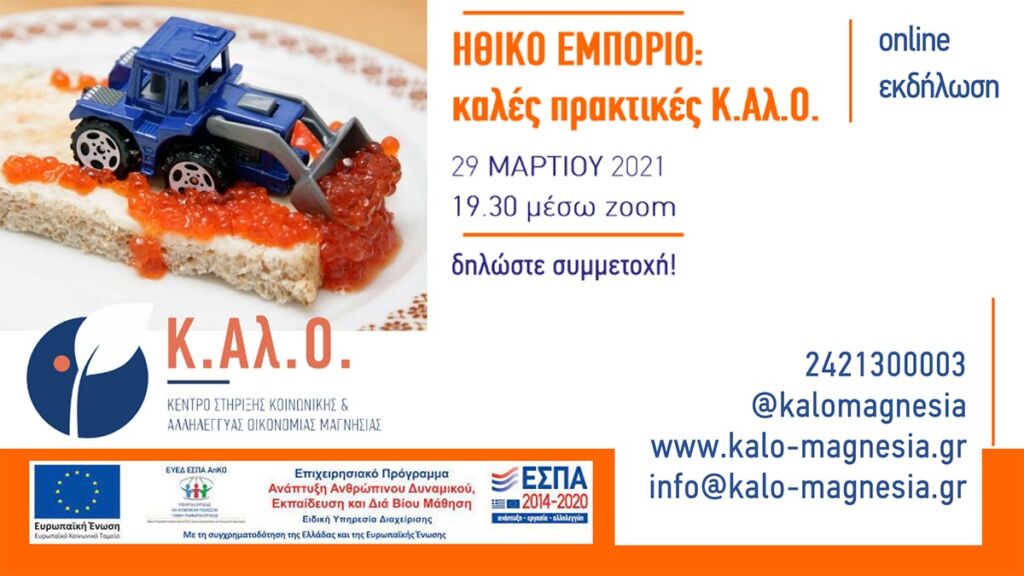 Περισσότεροι από 60 συμμετέχοντες, μέλη συνεταιριστικών σχημάτων, ενδιαφερόμενοι για την Κ.Αλ.Ο., παρακολούθησαν την online εκδήλωση προβολής καλών πρακτικών με τίτλο «Ηθικό Εμπόριο: Καλές πρακτικές Κ.Αλ.Ο.». Η εκδήλωση διοργανώθηκε από την Πορεία Υγείας, εμπνευστή του Chess Project, στις 29 Μαρτίου 2021, στο πλαίσιο λειτουργίας του Κέντρου Στήριξης Κ.Αλ.Ο. Μαγνησίας.