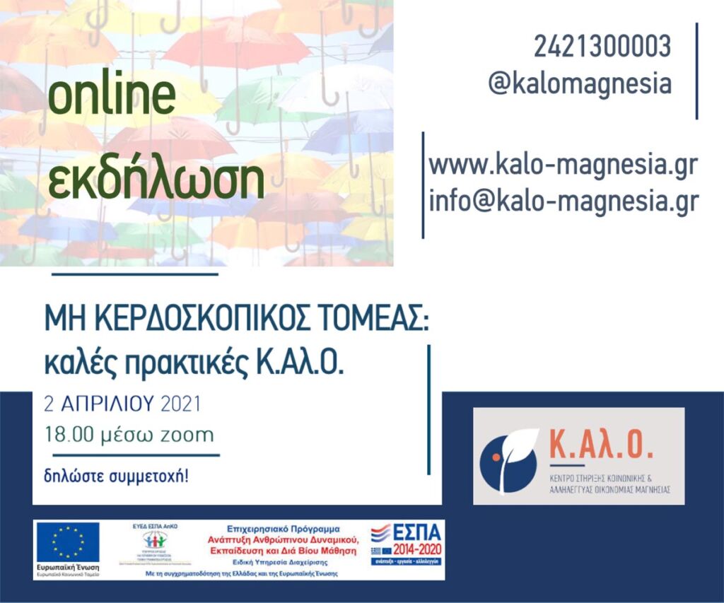 Με σαράντα και πλέον συμμετέχοντες πραγματοποιήθηκε στις 2 Απριλίου 2021 η online εκδήλωση προβολής καλών πρακτικών «Μη κερδοσκοπικός τομέας: Καλές πρακτικές Κ.Αλ.Ο.» από την Πορεία Υγείας, εμπνευστή του Chess Project, στο πλαίσιο του Κέντρου Στήριξης Κ.Αλ.Ο. Μαγνησίας.
