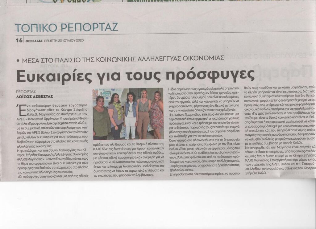 Η Πορεία Υγείας, εμπνευστής του Chess Project, συνδιοργάνωσε στις 22Ιουλίου 2020, στο πλαίσιο του Κέντρου Στήριξης Κ.Αλ.Ο. Μαγνησίας, το θεματικό εργαστήριο με τίτλο «Προσφυγικό: ευκαιρίες μέσα στην Κ.Αλ.Ο.» μαζί με την ΑΡΣΙΣ Κοινωνική Οργάνωση Υποστήριξης Νέων.Συμμετείχαν στελέχη και ωφελούμενοιτων δομών ΑΡΣΙΣ Βόλου.